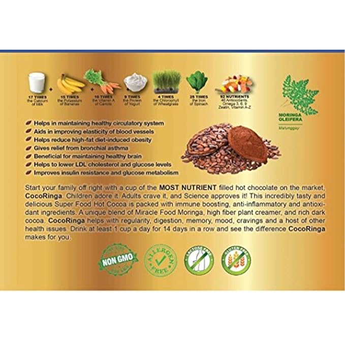 Experience the rich, comforting taste of CocoRinga Moringa Hot Chocolate, crafted with all-natural, dairy-free ingredients and no refined sugars. This 14-count pack supports brain, digestive, and heart health, making each cup a nourishing treat you can feel good about. Indulge in wellness with every sip.