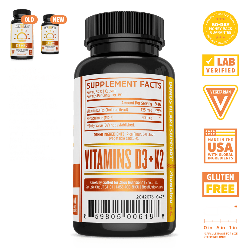 Boost your overall health with D3 K2! This powerful combo supports a healthy immune system, promotes a positive mood, and maintains a strong heart. Enjoy the benefits of both vitamin D3 and K2 in one convenient 60 count bottle. Take control of your health today!