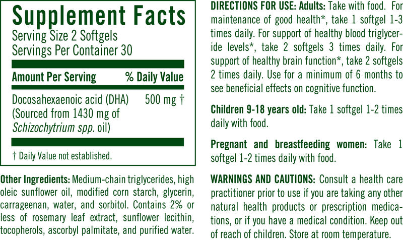 Enhance your brain's health and cognitive function with DHA Vegetarian Algae. These 60 count capsules are made from vegetarian algae, providing a plant-based source of this essential fatty acid. Promote good brain health and unlock your full potential with this natural supplement.