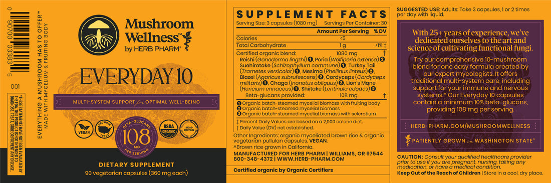Everyday 10 combines powerful organic mushrooms to support your immune and nervous systems naturally. USDA organic and vegan, this 90-count supplement boosts your wellness with clean, plant-based ingredients you can trust every day.