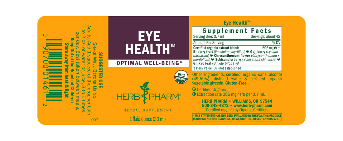 Eye Health 1oz. offers traditional, USDA organic support for vision and eye function. This gluten-free formula helps maintain clear sight and overall eye wellness naturally. Perfect for those seeking reliable, organic eye care.